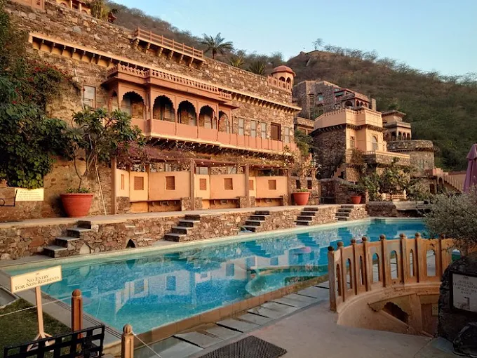 Neemrana Fort Palace boasts a unique fusion of traditional Rajasthani and colonial design elements. With 14 levels and 81 rooms and suites, each accommodation is distinctively named and adorned with antique furnishings, offering guests an authentic royal experience. The fort's hanging gardens, two swimming pools, and expansive courtyards further enhance its charm.