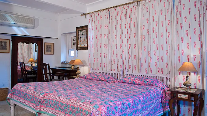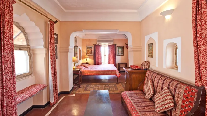Neemrana Fort Palace boasts a unique fusion of traditional Rajasthani and colonial design elements. With 14 levels and 81 rooms and suites, each accommodation is distinctively named and adorned with antique furnishings, offering guests an authentic royal experience. The fort's hanging gardens, two swimming pools, and expansive courtyards further enhance its charm.